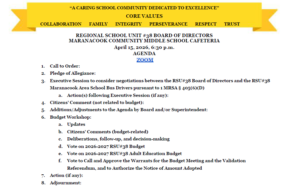 RSU #38 Board of Directors Meeting @ 6:30 P.M. in the MCMS Cafeteria. BOARD BUDGET WORKSHOP: FY27 Vote on Final Budget. The Agenda can be found online: https://www.maranacook.org/article/2809437 Zoom link: https://us02web.zoom.us/j/81286789672?